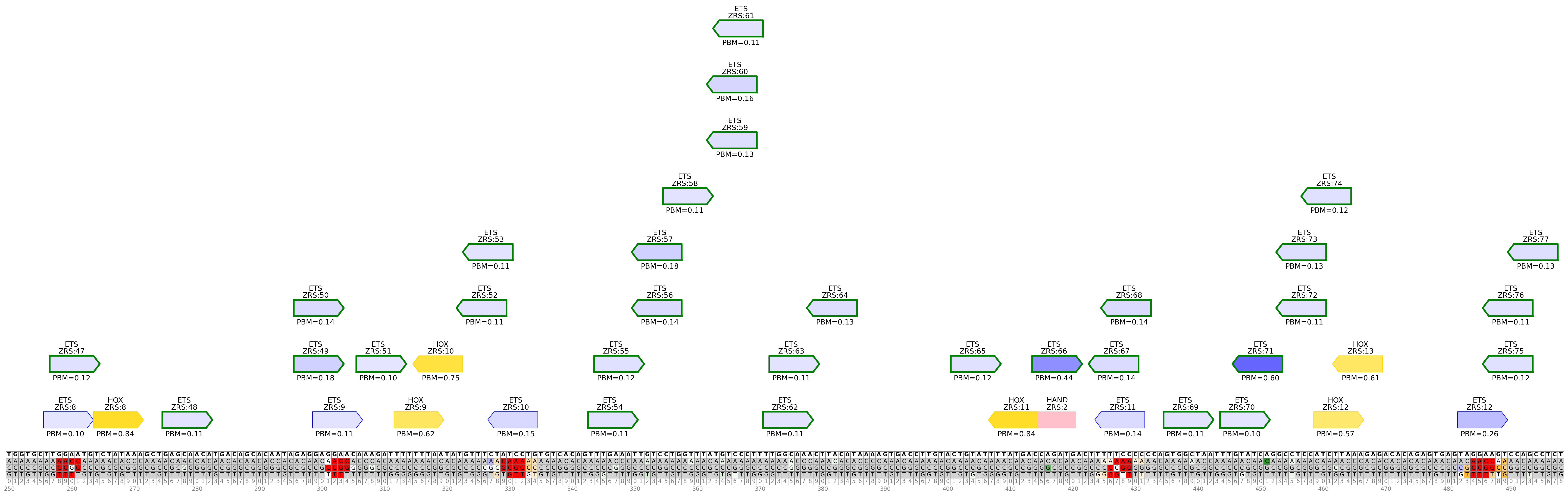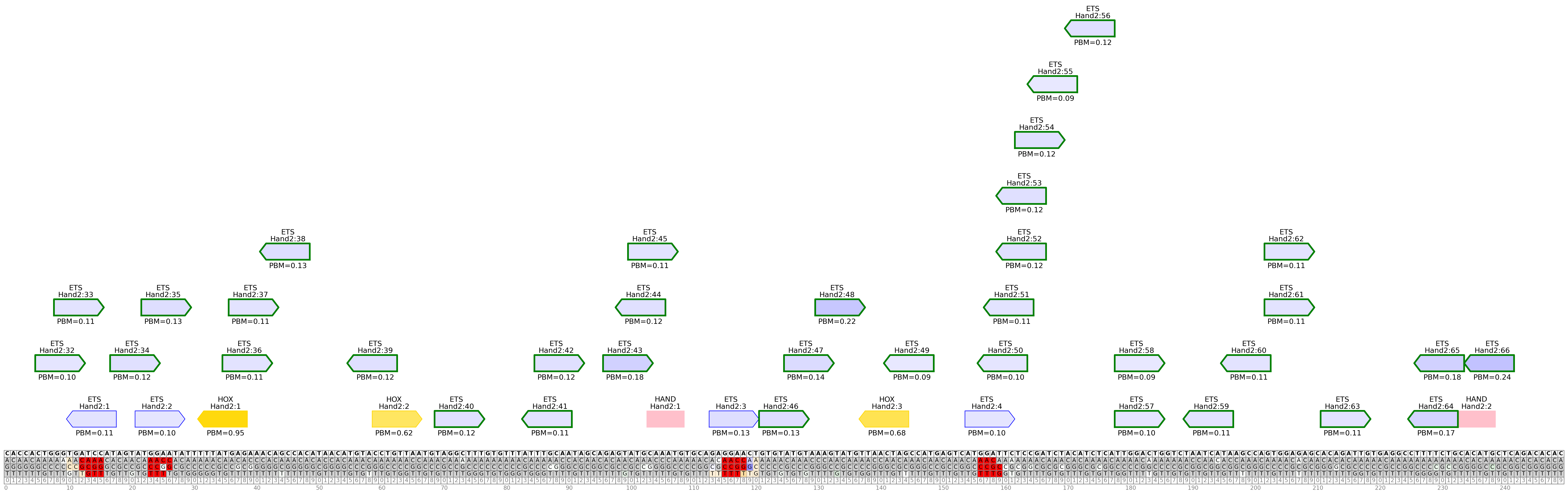 To find and plot all putative binding sites, we iterate across every k-mer in the DNA sequence and identify those that conform to the binding site definition for each transcription factor. The user can also choose to plot all denovo binding sites created from SNVs, in addition to existing putative binding sites.