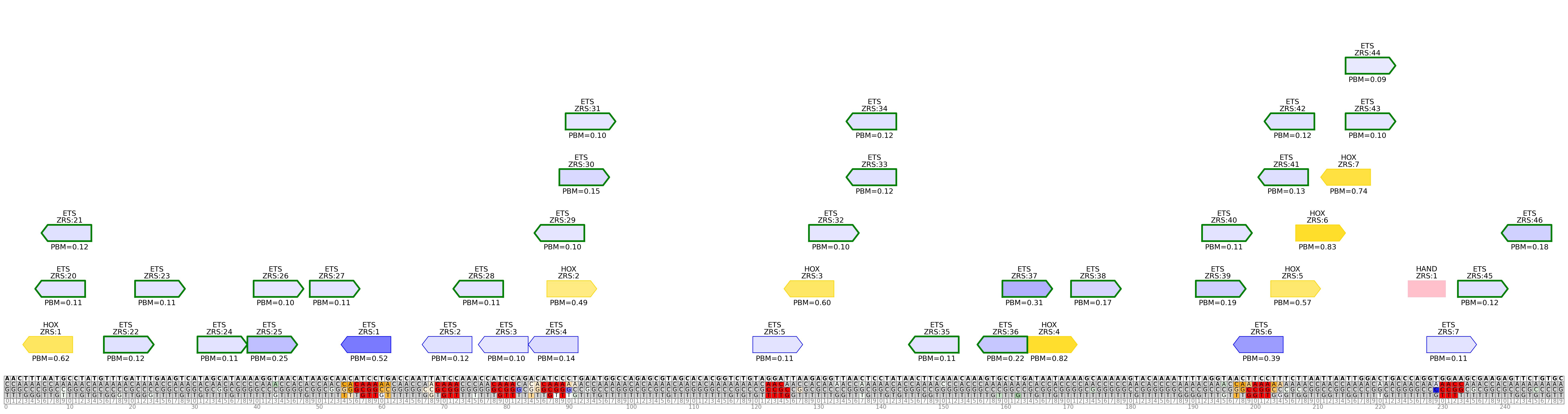 The in silico SNV analysis is performed on one transcription factor, but the binding sites of multiple different transcription factors can be displayed on the plot. Each binding site is labeled with the TF name and a unique binding site ID. If the relative affinity/score dataset is provided for a transcription factor, the affinity/score of this site will be labeled and the intensity of the binding site’s color will be proportional to the affinity/score.