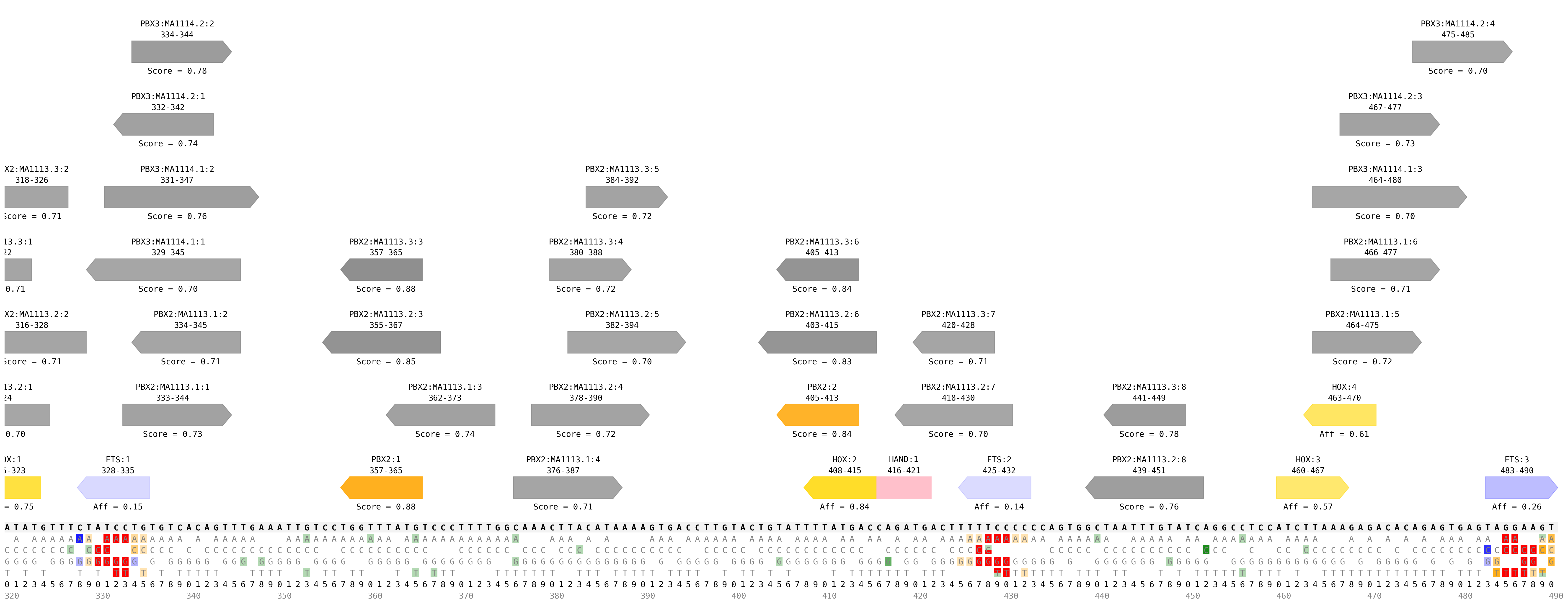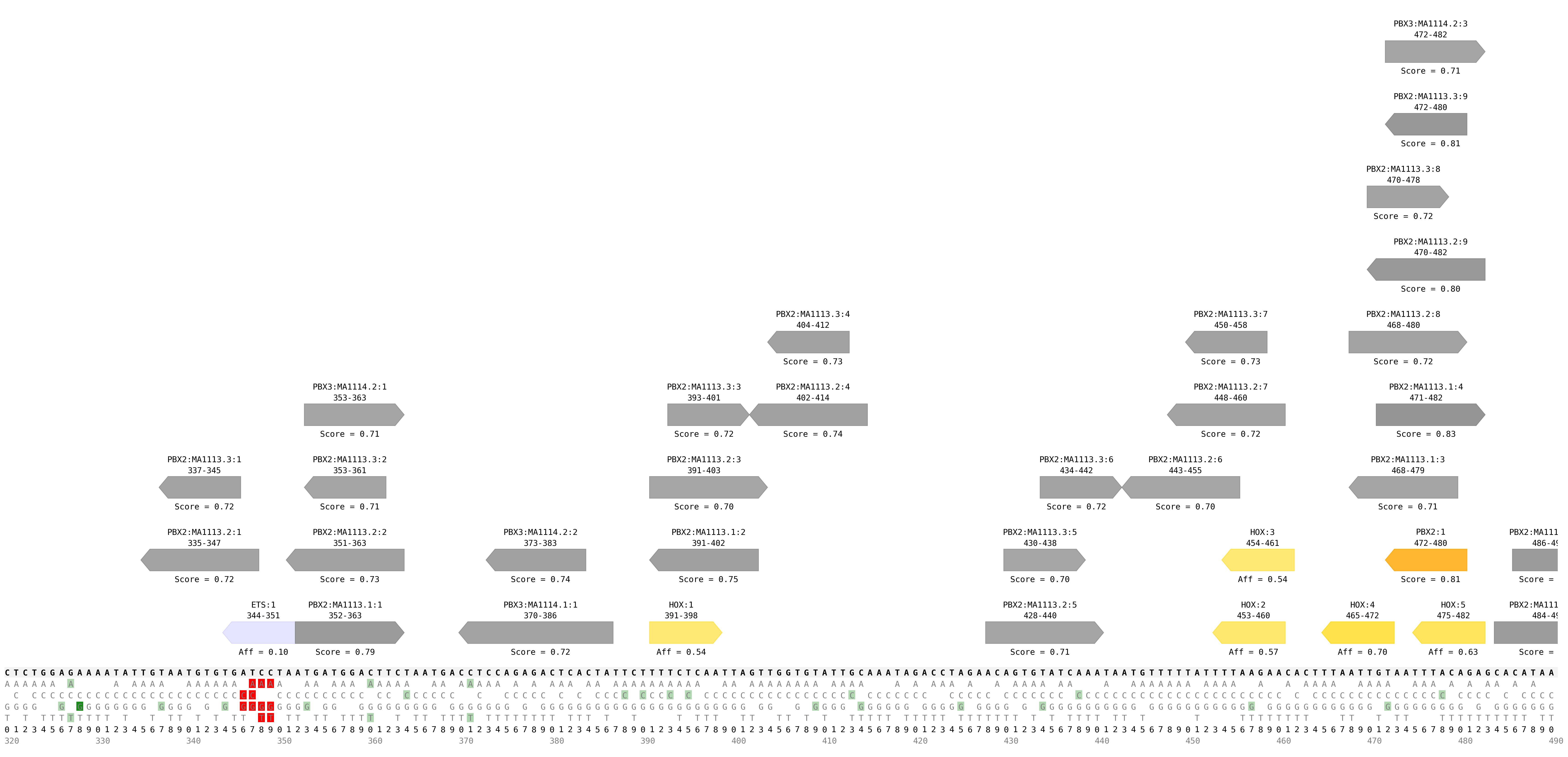 The in silico SNV analysis is performed on one transcription factor, but the binding sites of multiple different transcription factors can be displayed on the plot. Each binding site is labeled with a unique binding site ID and its start and end position. If reference data is provided for a transcription factor, the affinity/score of this site will be labeled and the intensity of the binding site’s color will be proportional to the affinity/score.