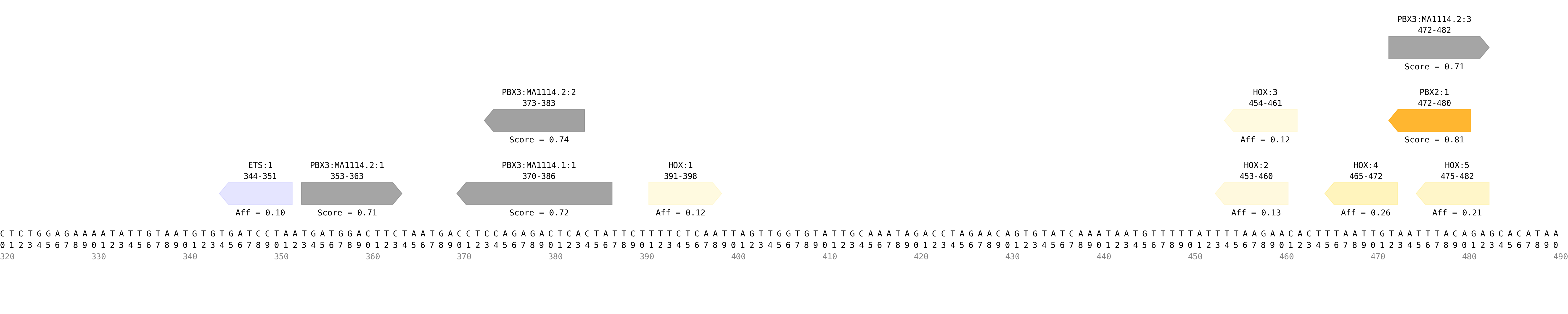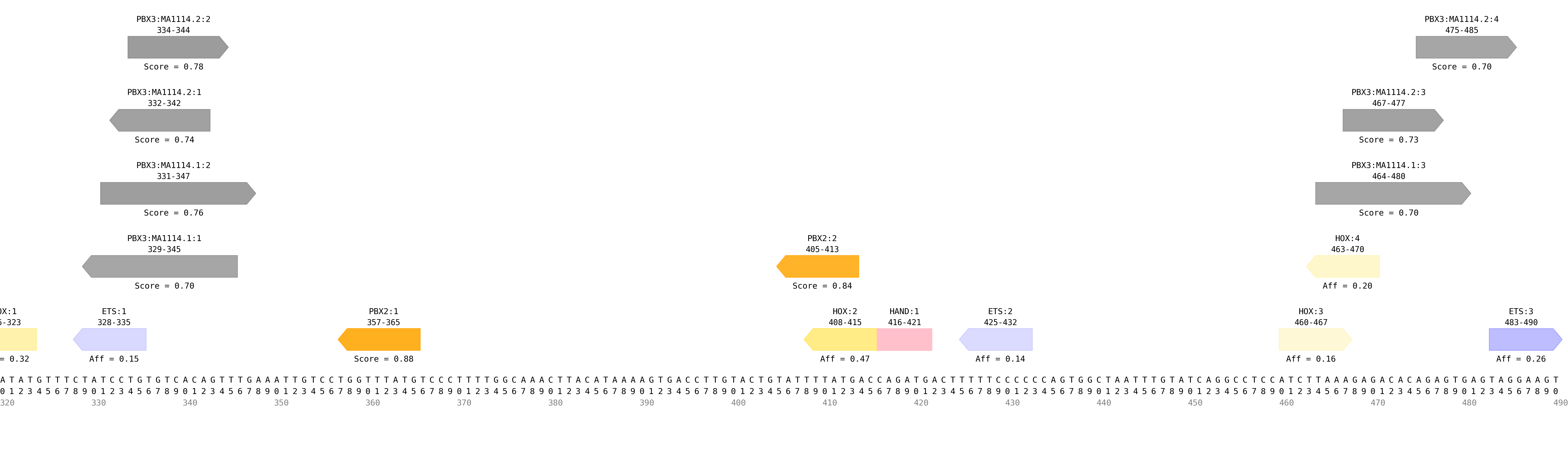 annotates transcription factor binding sites across a DNA sequence. Multiple transcription factors can be analyzed. Each binding site is labeled with a unique binding site ID and its start and end position. If reference data is provided for a transcription factor, the affinity/score of this site will be labeled and the intensity of the binding site’s color will be proportional to the affinity/score.
