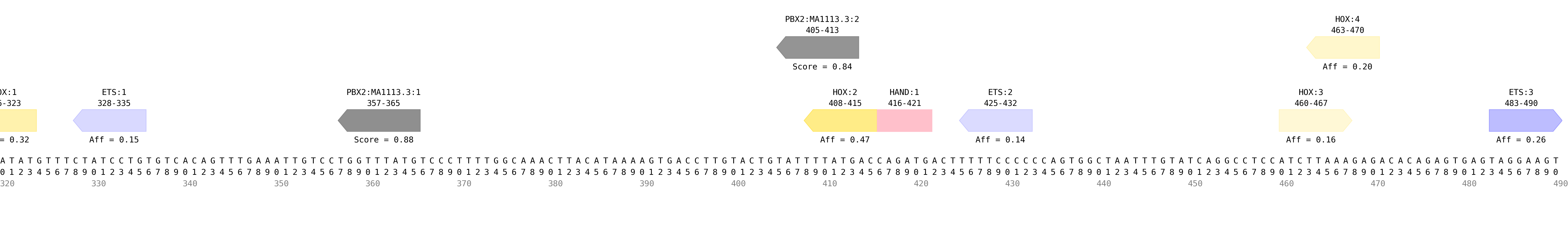 annotates transcription factor binding sites across a DNA sequence. Multiple transcription factors can be analyzed. Each binding site is labeled with a unique binding site ID and its start and end position. If reference data is provided for a transcription factor, the affinity/score of this site will be labeled and the intensity of the binding site’s color will be proportional to the affinity/score.